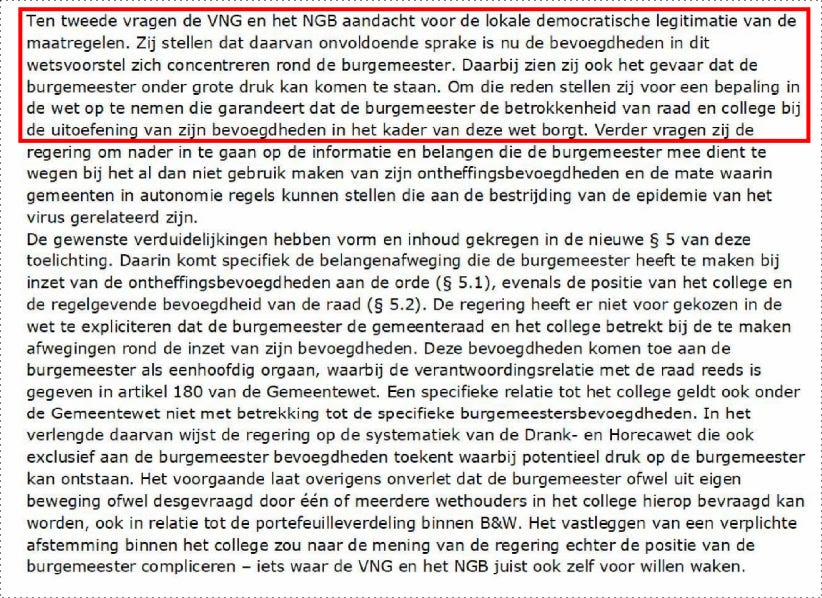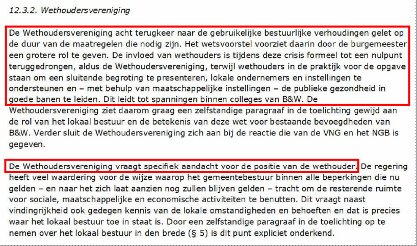 De positie van burgemeesters werd binnen de gemeente zeer machtig doordat de invloed van wethouders en de gemeenteraad werd geminimaliseerd. Door de constructie van de 25 veiligheidsregio’s die landelijk beleid konden opleggen aan burgemeesters, die op hun beurt autonoom konden regeren over een gemeente met minimale inbreng van wethouders en gemeenteraad, was Nederland centraal te besturen op landelijk niveau. Dit concludeerde de Vereniging van Nederlandse Gemeenten (VNG) en het Nederlands Genootschap voor Burgemeesters (NGB).